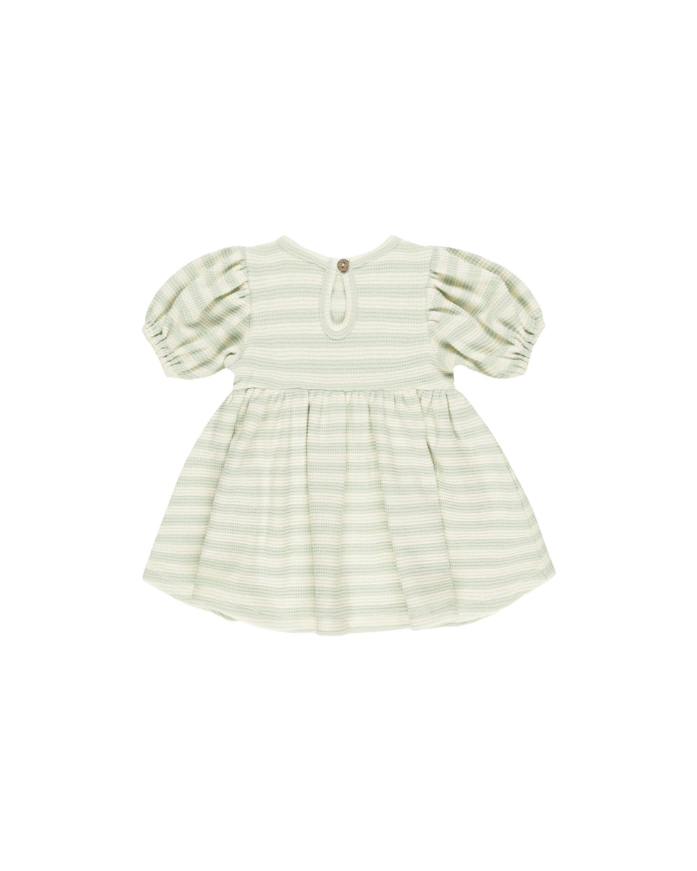 Our babydoll Darla Dress features an empire waist with balloon sleeves and a coconut button keyhole at the back neck. Coordinating bloomers included. Made from our waffle knit fabric.